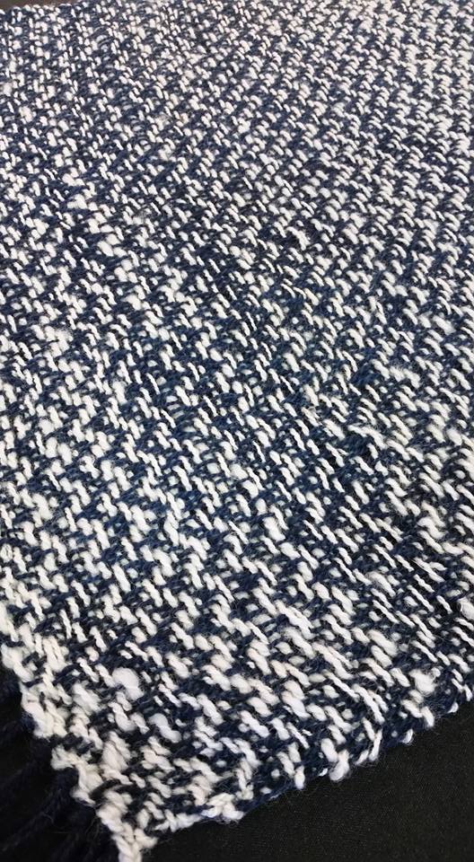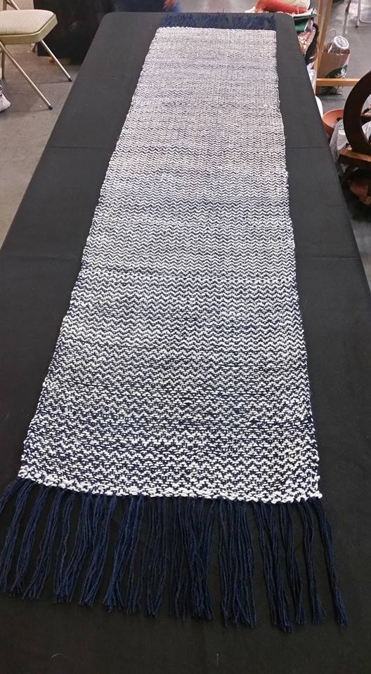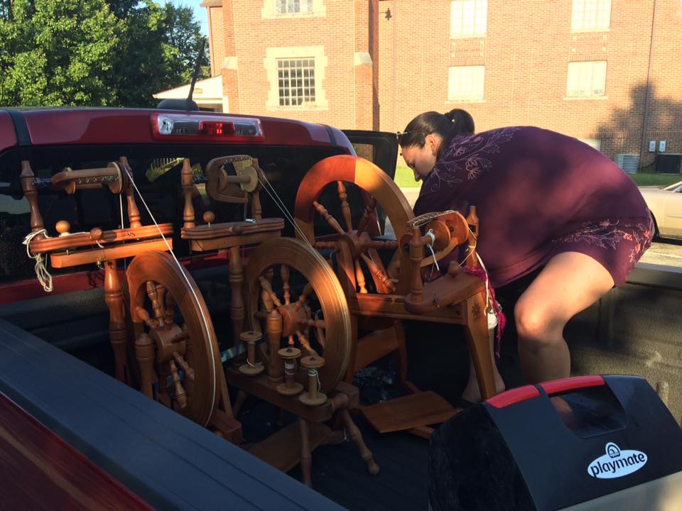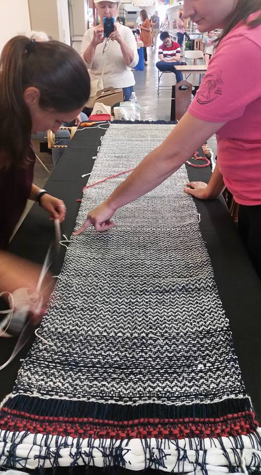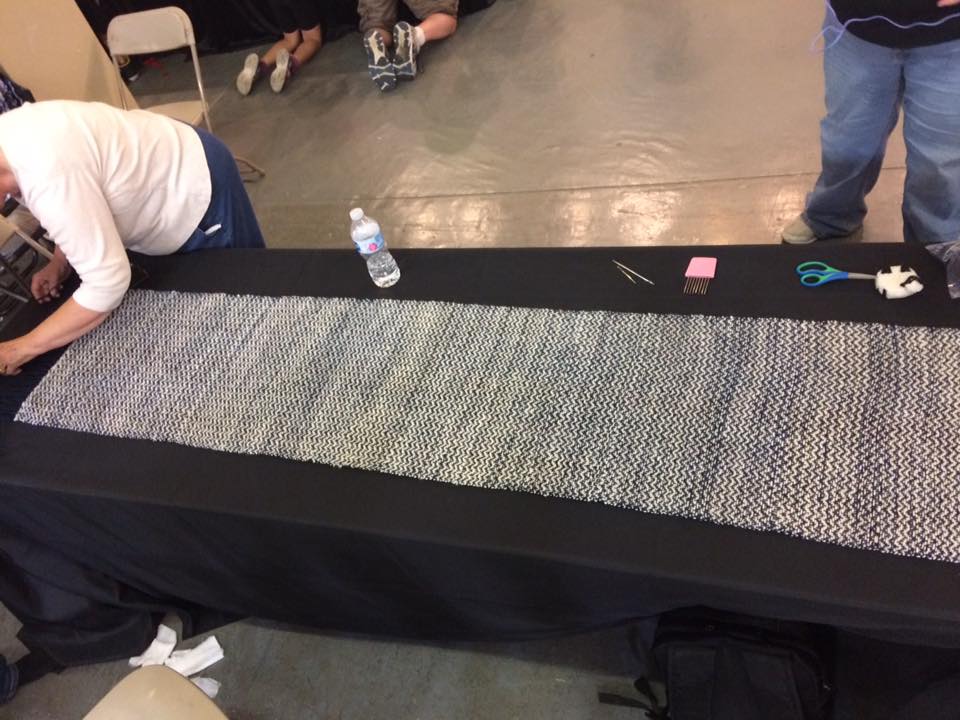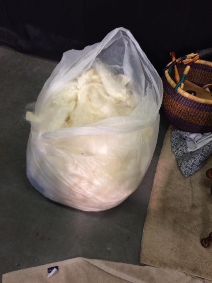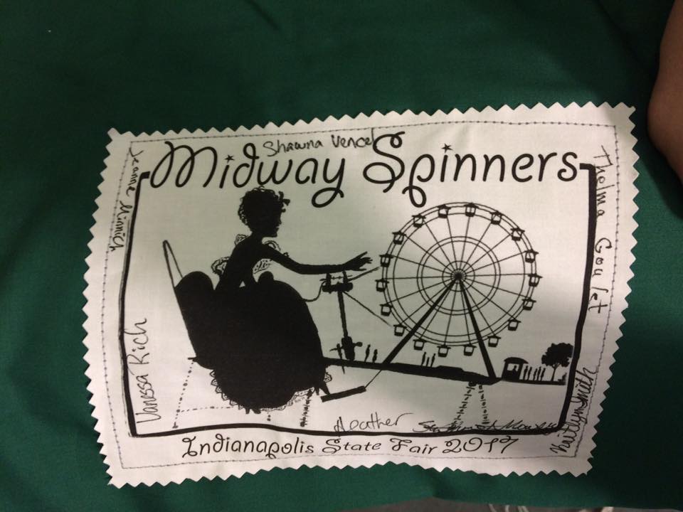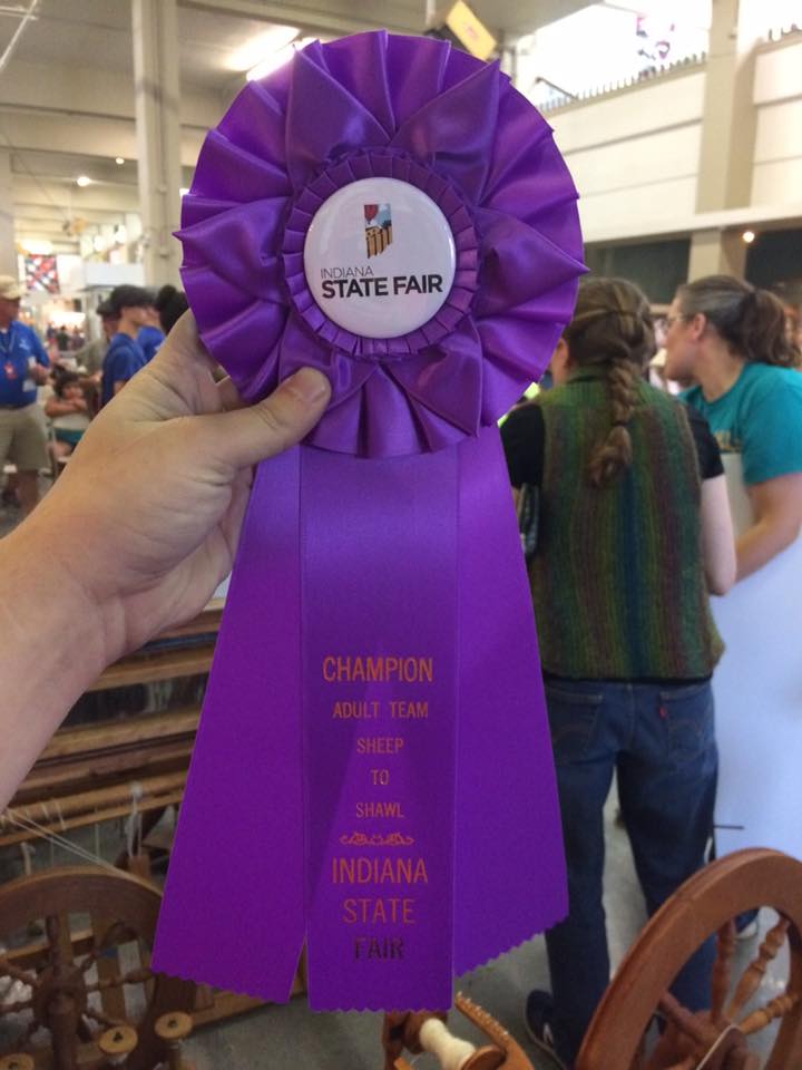 August 20, Cupcake had the great honor of her fleece playing an integral part in the Indiana State Fair’s Sheep to Shawl Competition. The Midway Spinners Sheep to Shawl team had 4 hours to turn Cupcake’s fleece into a 22″x72″ woven shawl. They were allowed to wash the fleece ahead of time, and have the loom warped. (I believe the warp was hand-spun, hand-dyed yarn also from Cupcake’s fleece, but not 100% certain on that one…) So at the competition, the weft is spun from washed locks, and the spinning, weaving and finishing must be completed in 4 hours or less! Sound impossible? Apparently not!